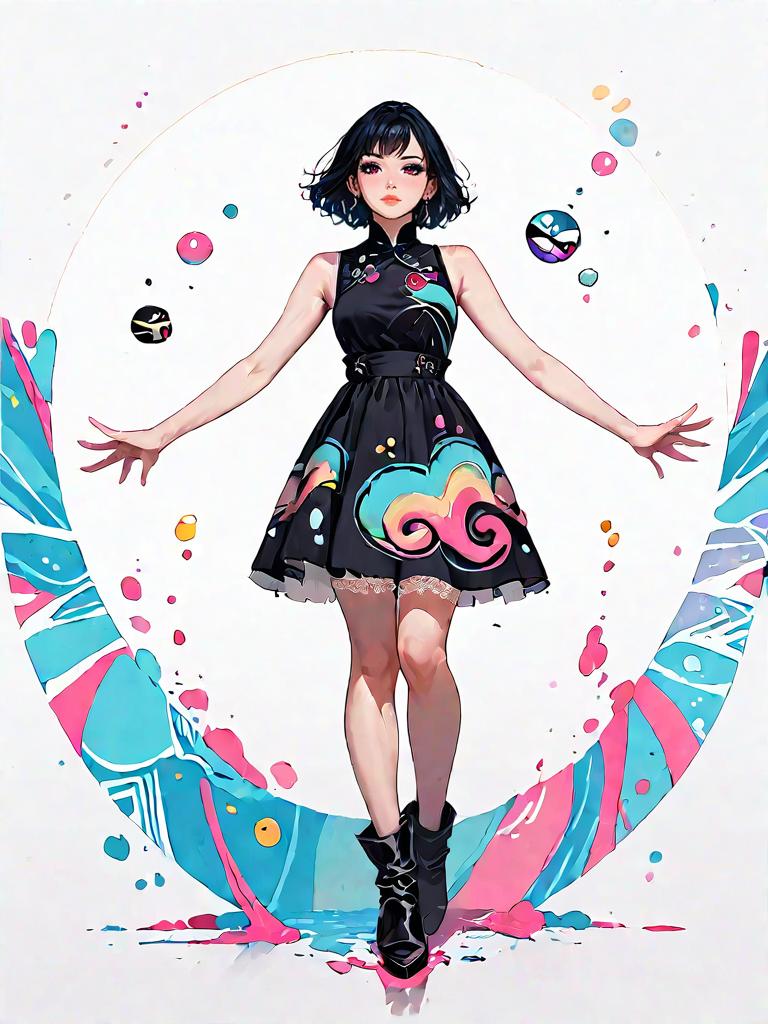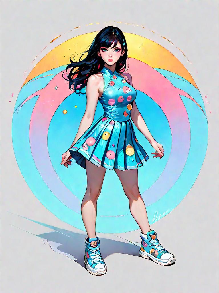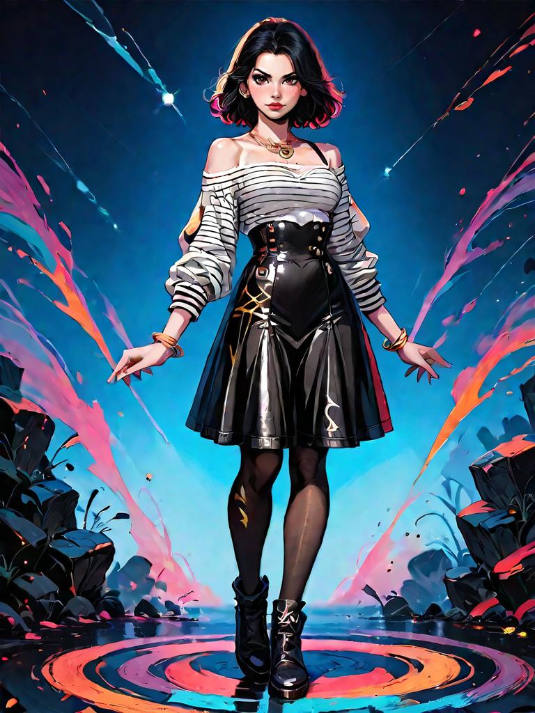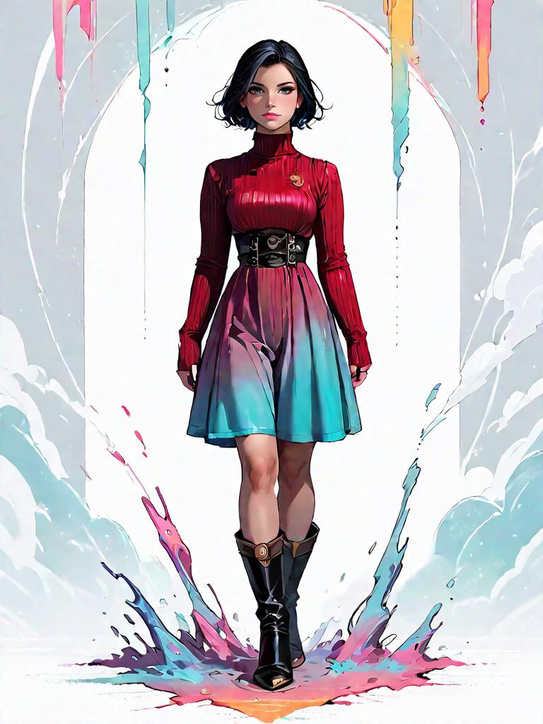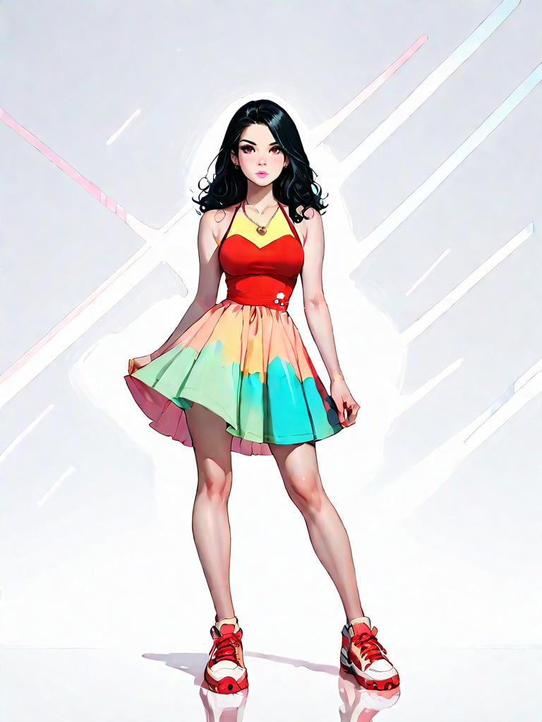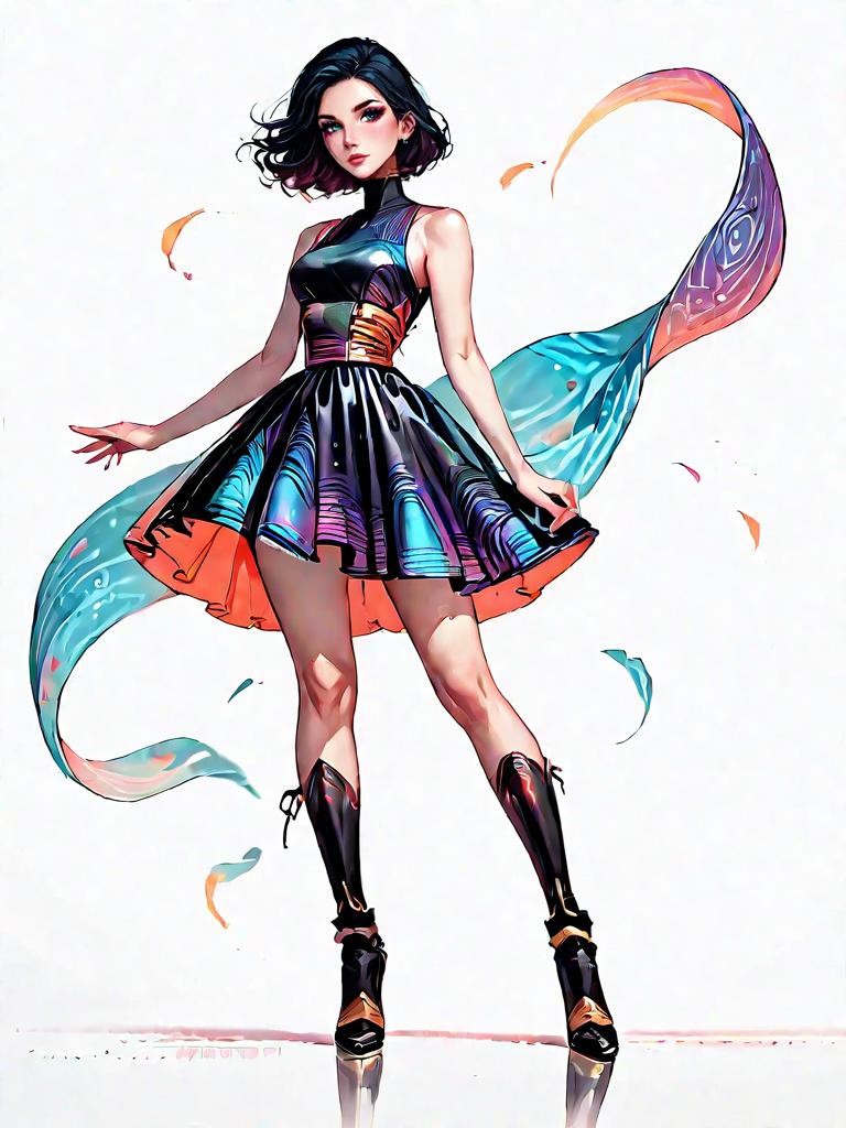 1girl, source_comics, realistic face, full body shot, Woman, glam, metallic finish sleeveless dress with plunge neckline, knee-length, black strappy heels.
