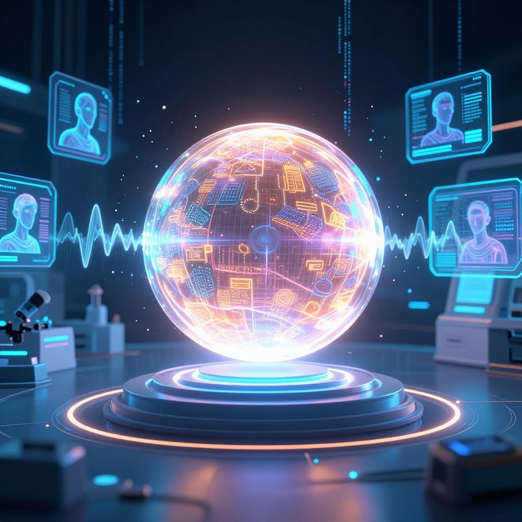Neon-lit, glowing globe with circuit patterns in the center, surrounded by holographic portraits and a blue waveform on a futuristic, dark room.