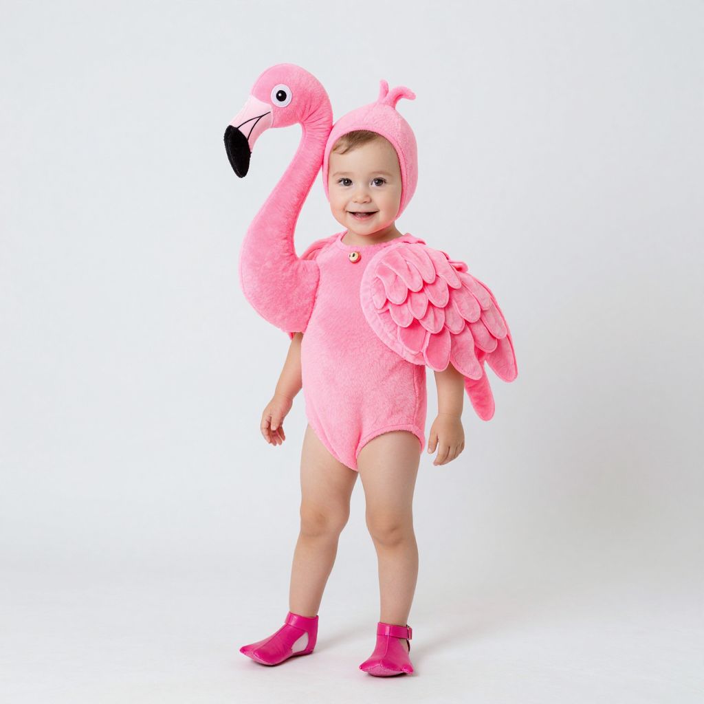 Flamingo Costume Toddler, baby in a pink flamingo costume standing in front of a white backdrop