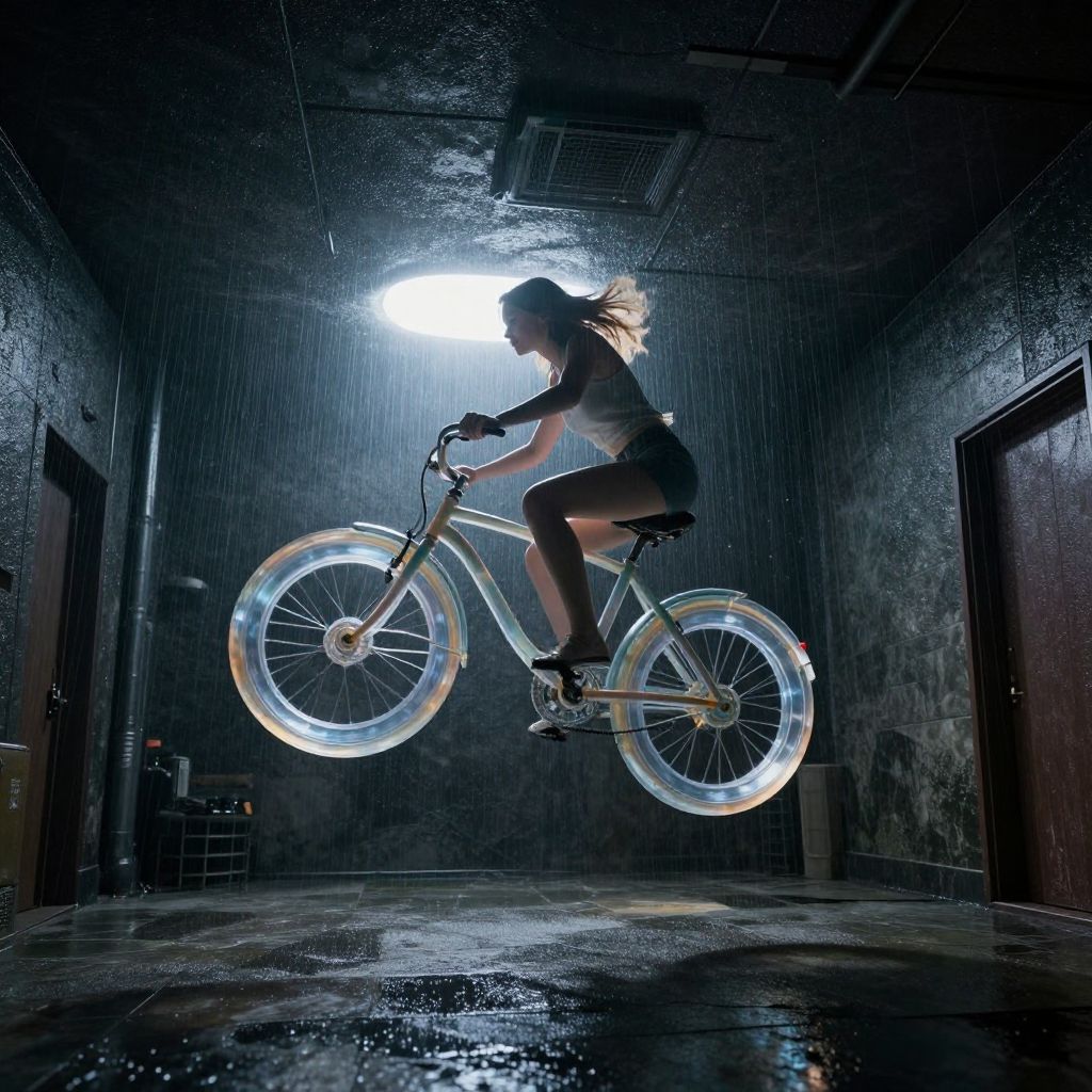 A photograph of a silhouette of a woman in a black tank top and shorts, mid-air while riding a glowing, neon-lit bicycle. She is in a dimly lit, industrial-style room with wet, reflective floors and dark, textured walls. Rain is visibly falling, and a bright light source from above creates a dramatic, backlit effect. The woman's long hair flows behind her, and the bike's wheels and frame emit a vibrant blue-white glow. A door is on the right, and a chair is faintly visible on the left. The scene exudes a dynamic, action-packed atmosphere.