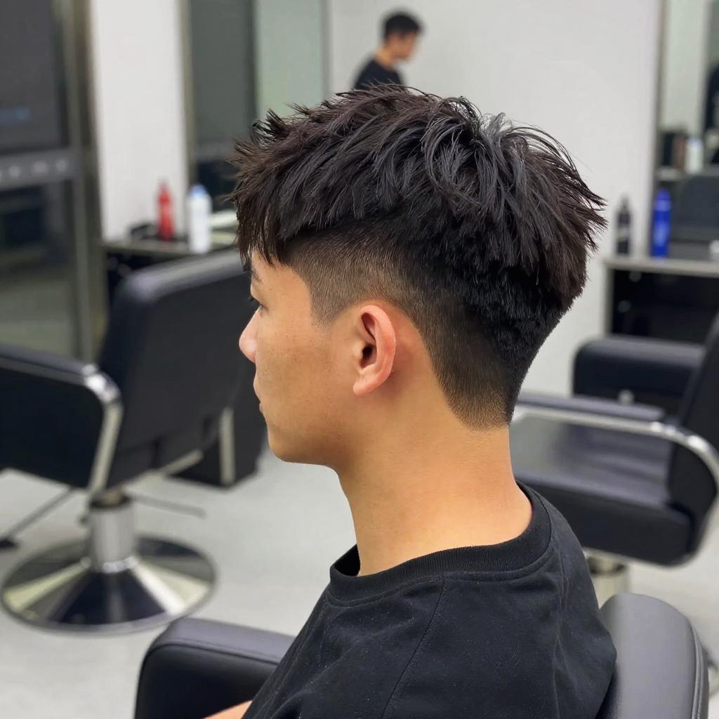 Side profile of a person showcasing level 1 fade haircut, intricate fade details visible, matte finish hair texture, modern fashion outfit, subtle bokeh effect in background, crisp and realistic style.