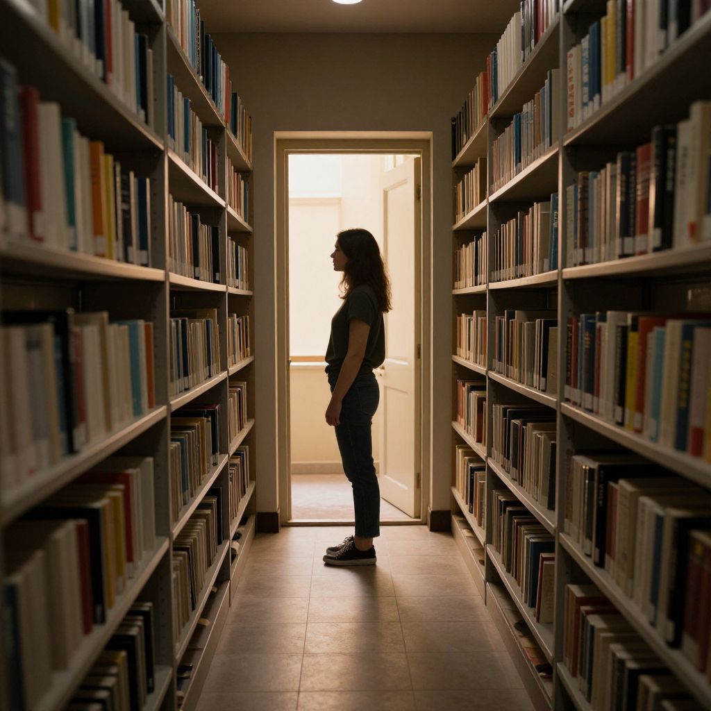 Woman standing in a dimly lit library, framed by towering bookshelves filled with colorful spines, casting her shadow on the tiled floor as she gazes through an open doorway bathed in golden light.