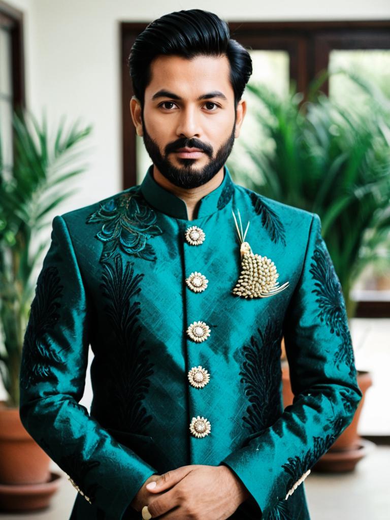 Photograph of a handsome South Asian man with a black beard and mustache, wearing an ornate teal sherwani with gold embroidery, standing indoors