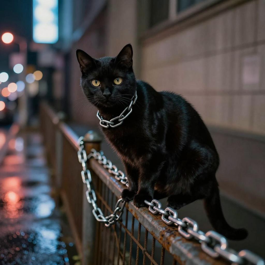 Black cat with chain, urban street scene at night, the cat perched on a rusty metal fence wrapped in a silver chain, neon lights reflecting on wet pavement, cyberpunk aesthetic, high contrast