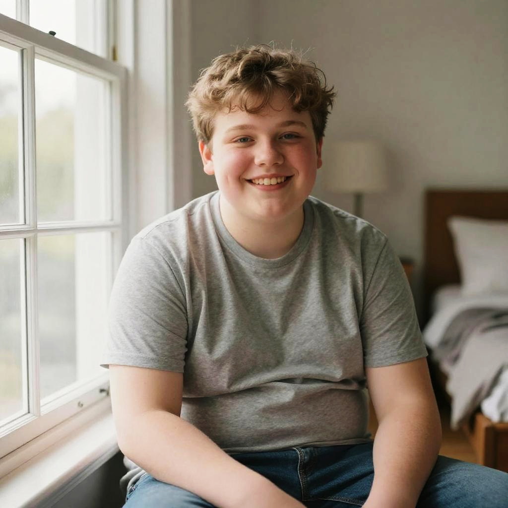 Chubby teen smiling with confidence, sitting by a cozy window with warm natural light, casual outfit, soft-focus background of a modern bedroom