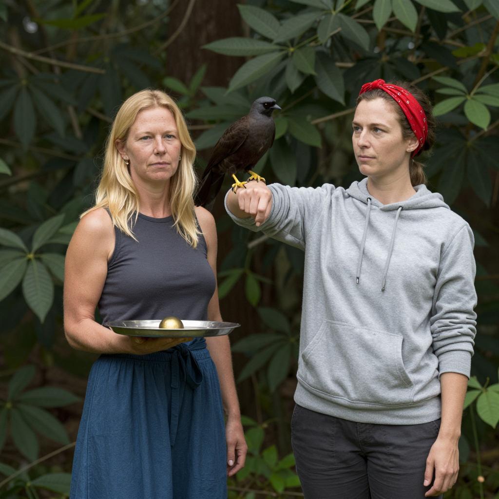 Photograph of two women and a bird. Woman on left with blonde hair, gray sleeveless top, and blue skirt, holding a metal tray with a golden object. Woman on right with red headband, gray hoodie, and dark pants, holding a bird on her raised arm. Background is lush green foliage. Bird has dark brown feathers with yellow accents. Women's expressions are neutral. Bird's expression is neutral. Women standing, bird on right woman's arm. Forest setting.