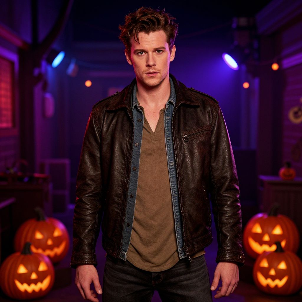 Miles Teller Halloween costume, a detailed cosplay of a rugged, rebellious character with a leather jacket and casual attire, highlighted under neon Halloween street lights with spooky decorations and glowing jack-o'-lanterns in the background.