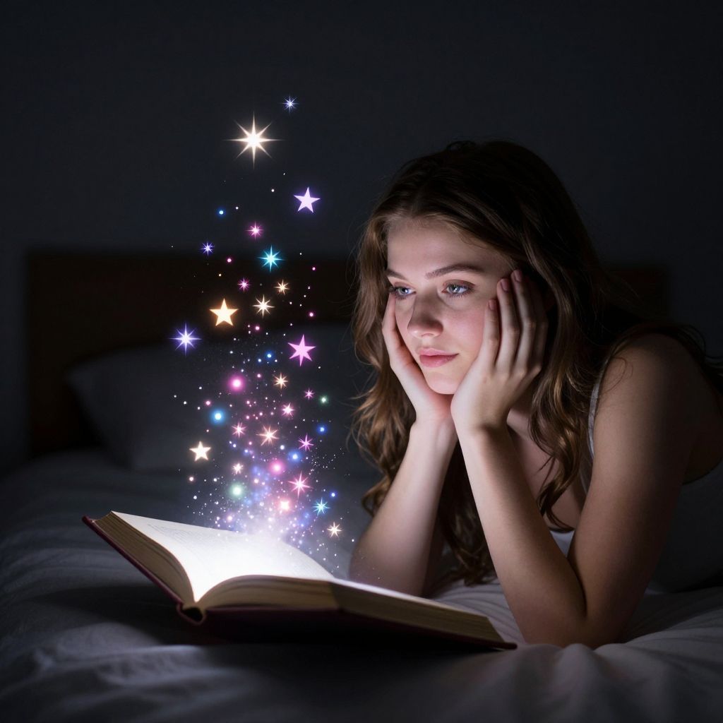 Photograph of a young woman with long brown hair, lying on a bed, hands on cheeks, reading an open book emitting colorful, glowing stars in
