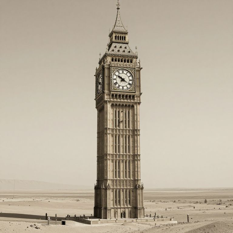 Sepia-toned photograph of London's iconic Big Ben clock tower standing alone in a barren, desert-like landscape under a clear sky.