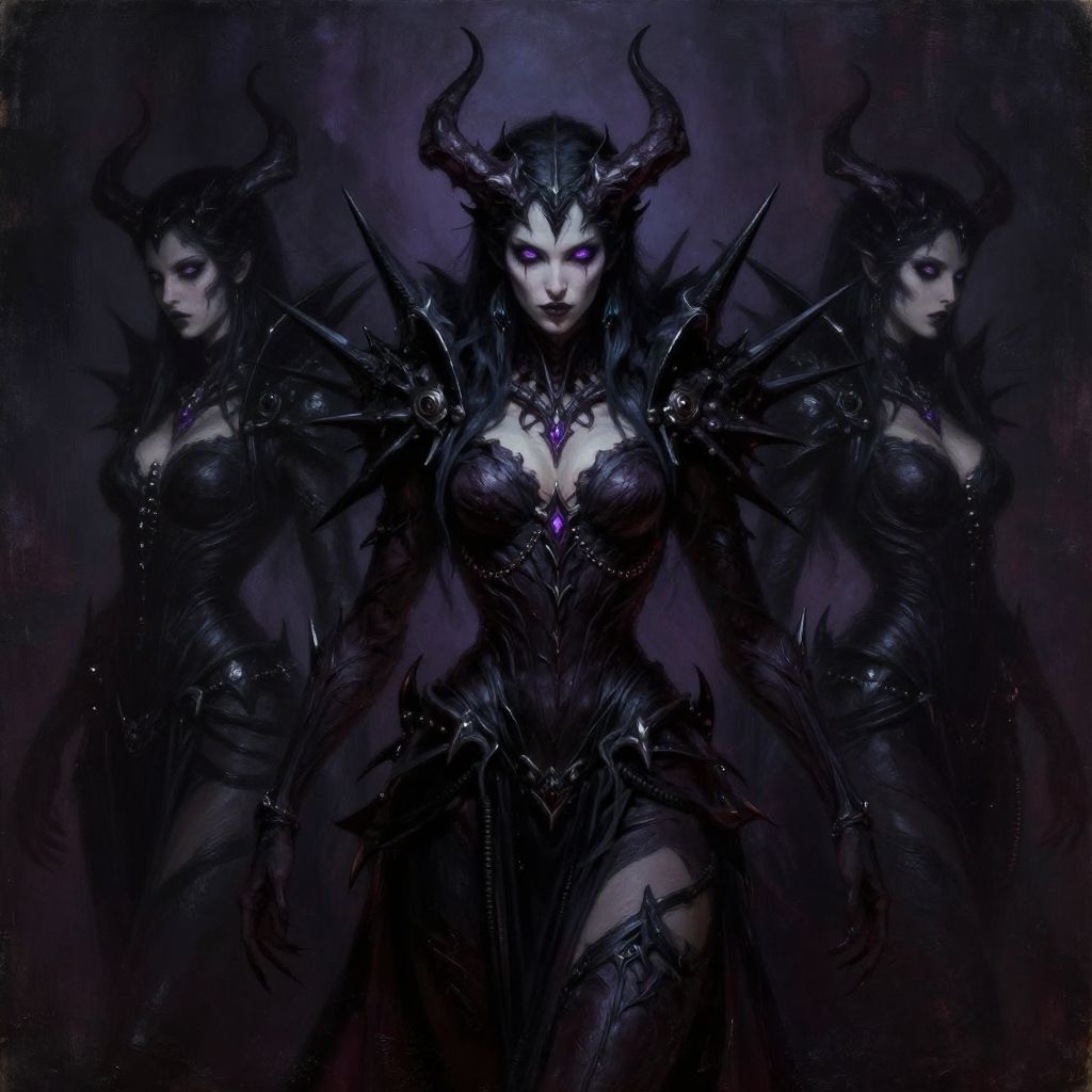 Digital fantasy artwork of a dark, demonic queen with black horns, intricate armor, glowing eyes, and three shadowy reflections in a dark, purple-h