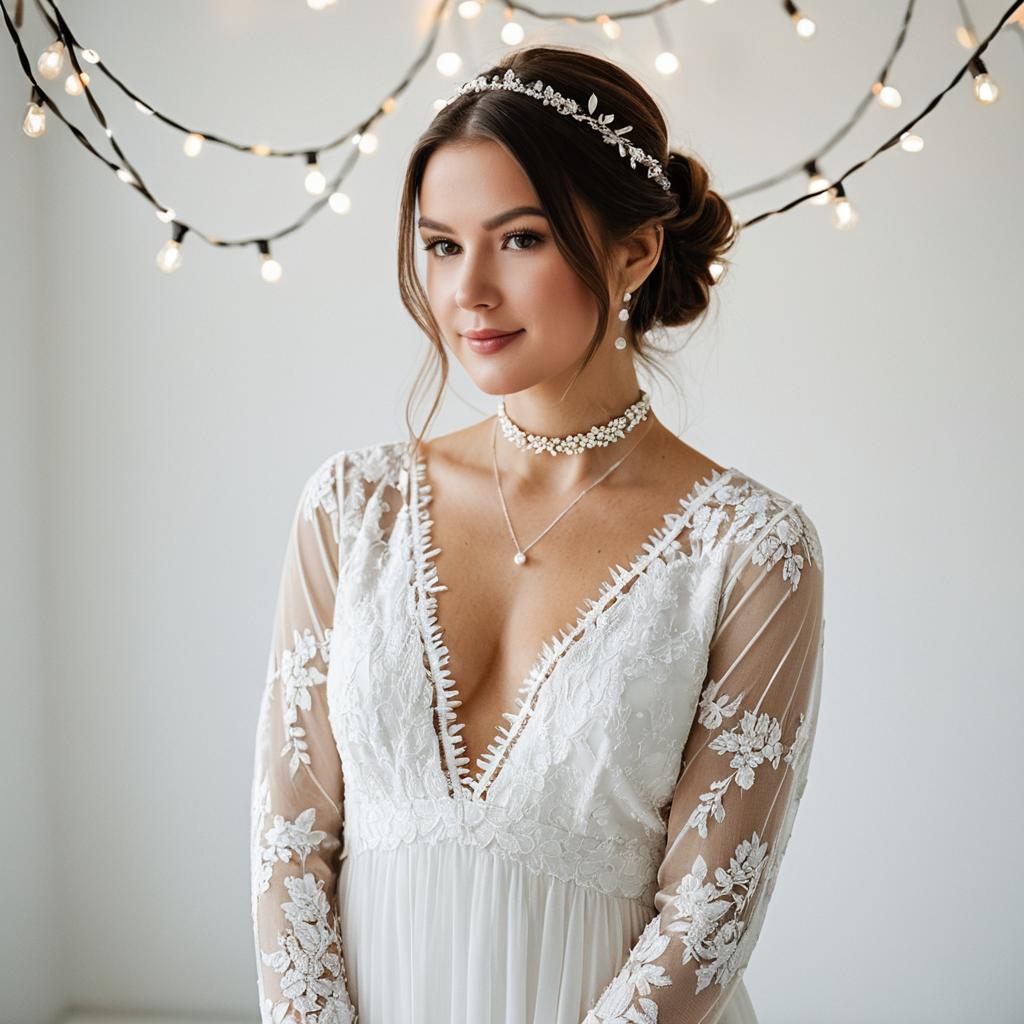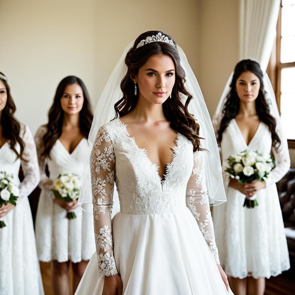 Bride getting ready outfit, photograph of beautiful young woman, wedding dress, sheer long sleeves, floral lace patterns, deep V-neck, white dress, elegant veil, tiara, fair skin, blue eyes, brown hair in updo, soft lighting, blurred background, other women in similar dresses, indoor, warm tones, realistic, natural light, portrait, focused on subject, wedding, elegant, detailed lace, subtle makeup, romantic atmosphere, detailed ures, wedding day, classic style