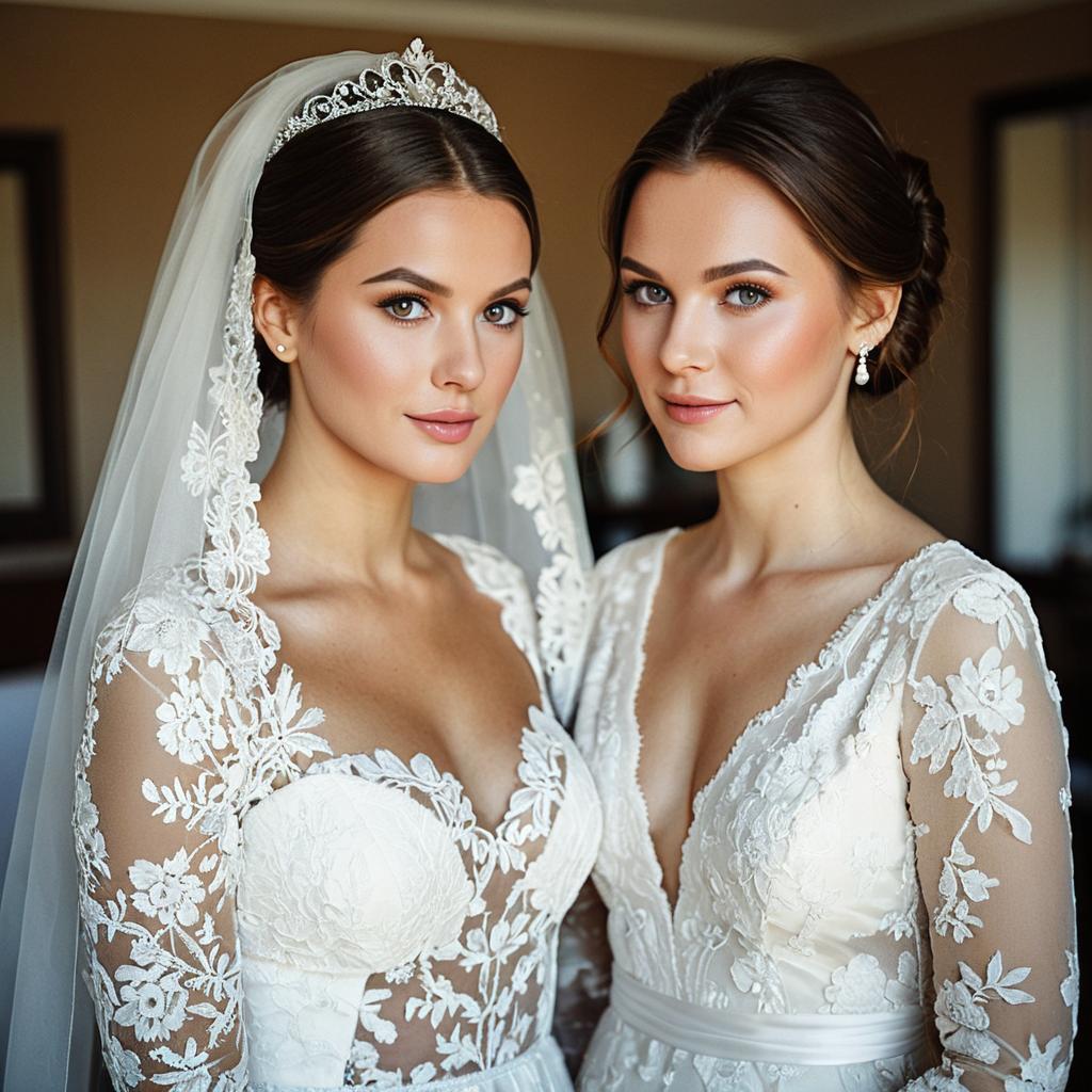 Portrait of two beautiful young brides with fair skin and blue eyes, wearing white wedding dresses featuring sheer long sleeves and intricate floral lace patterns. One bride wears an elegant veil and a tiara, both have brown hair styled in an updo. Soft natural light highlights the detailed lace and subtle makeup in a warm indoor setting.