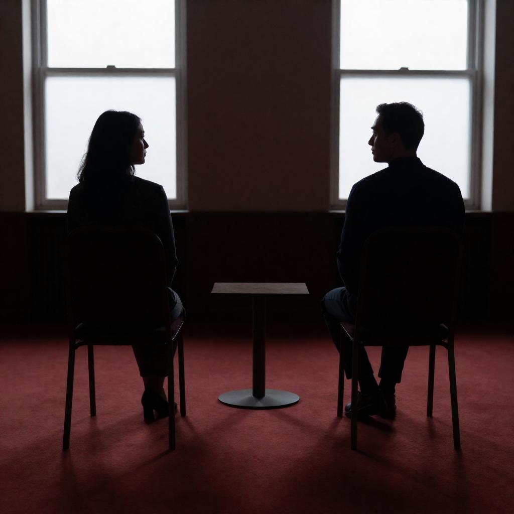 Photograph of two silhouetted figures sitting in darkened chairs facing each other in a dimly lit room with two bright windows in the background. The figures are on a red carpet, with a small table between them. The scene is shadowy, emphasizing their profiles and the contrast between the dark room and bright windows.