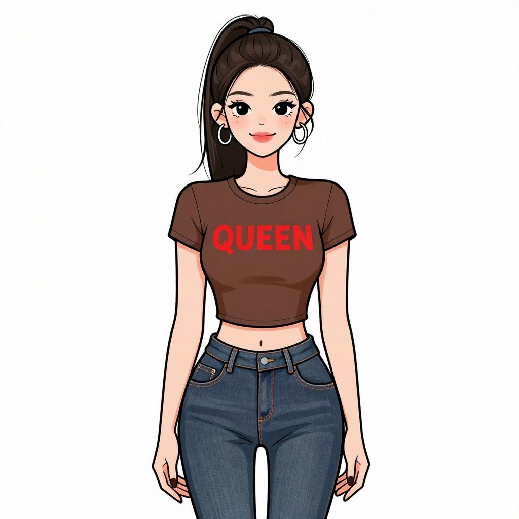 Digital drawing of a young woman with fair skin and black hair in a high ponytail. She wears a brown, short-sleeve, crop top with "QUEEN" in bold red letters, and dark blue, high-waisted jeans. She has large, hoop earrings, and a slight smile with red lipstick. Her arms hang by her sides, and she stands against a plain white background. The style is anime-inspired with clean lines and bright colors.
