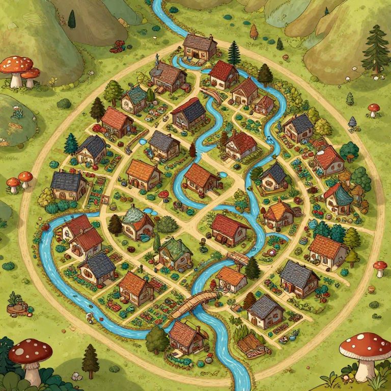 Whimsical digital illustration of a circular village with winding blue rivers, red-roofed houses, and colorful landscapes surrounded by mushrooms and trees.