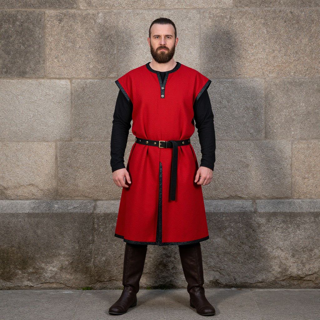 A photograph of a bearded man standing against a stone wall. He's wearing a medieval-style red tunic with black trim, belted at the waist, over black long sleeves. He has dark brown boots and a serious expression. The stone wall behind him has a rough texture, and the ground is paved. The lighting is even, highlighting his outfit and the stone surface.