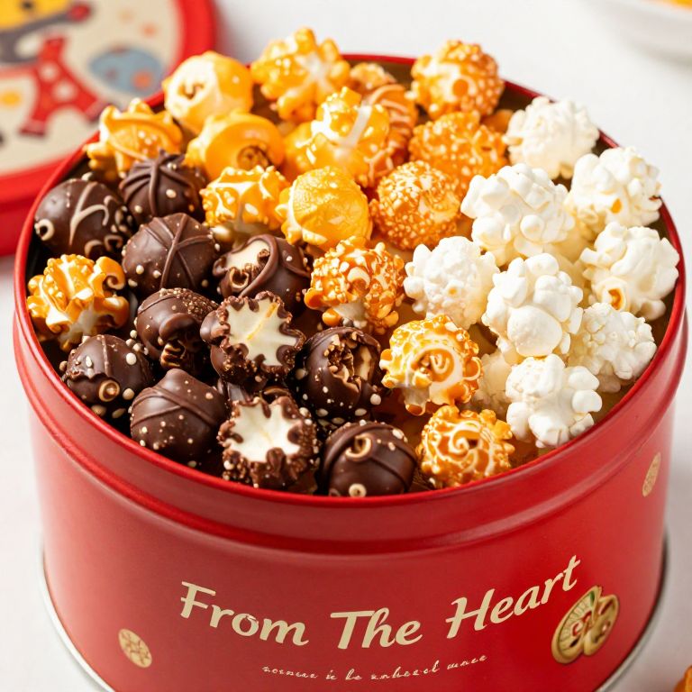 Colorful popcorn varieties—dark chocolate, orange, and white—are neatly layered inside a vibrant red tin labeled \"From The Heart,\" showcasing a festive and indulgent treat.