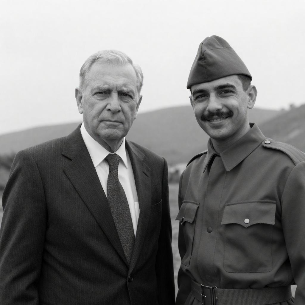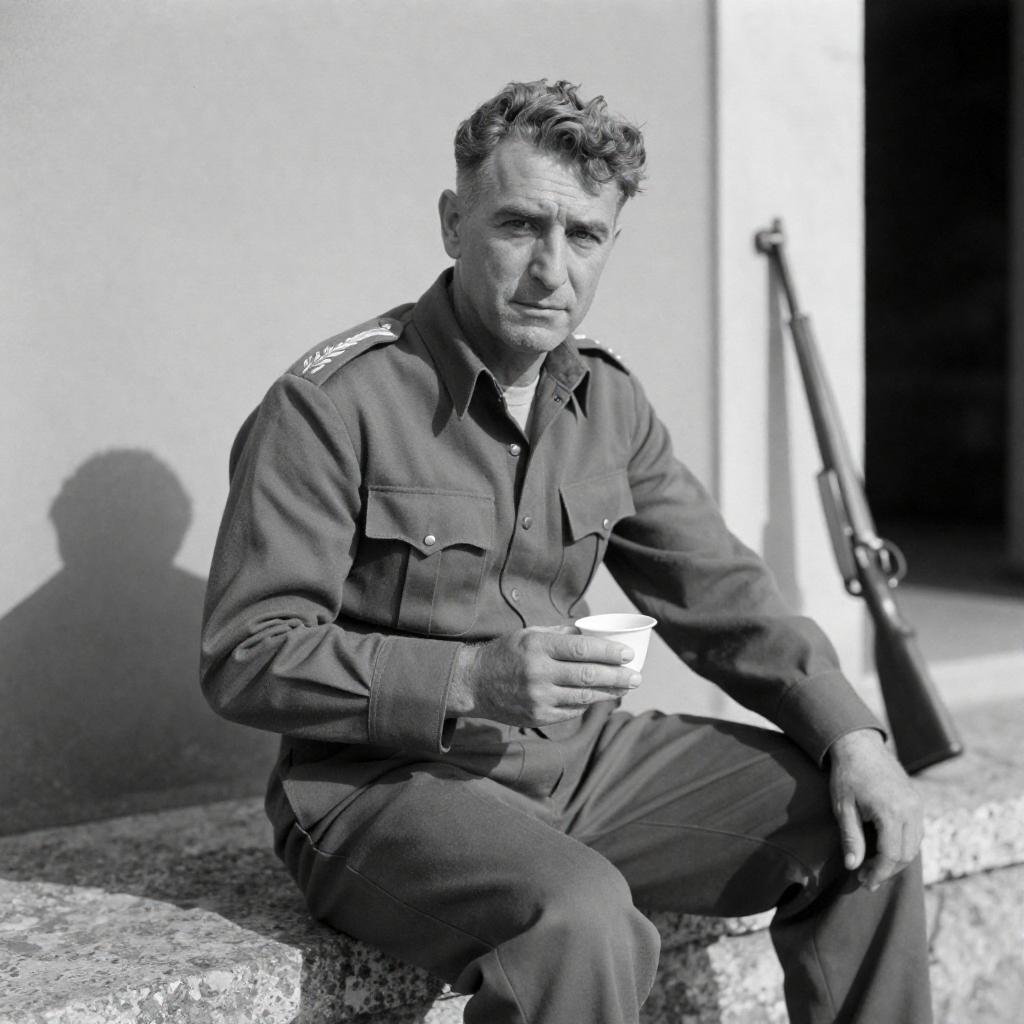 Black-and-white photograph of a middle-aged man with wavy, light hair, sitting on a rough, sunlit stone surface. He wears a military-style uniform with a decorative shoulder insignia, holding a small white cup in his right hand. His expression is serious. A rifle leans against a ured wall in the background. Sunlight casts shadows, highlighting the rough stone ure and his uniform details. The man is positioned slightly to the left, looking towards the camera. The setting is outdoors.