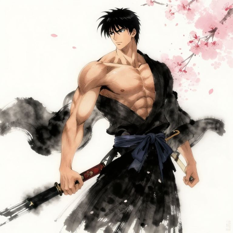 Muscular, shirtless anime man with black hair and blue eyes, holding a katana, wearing a torn black kimono, against a white background