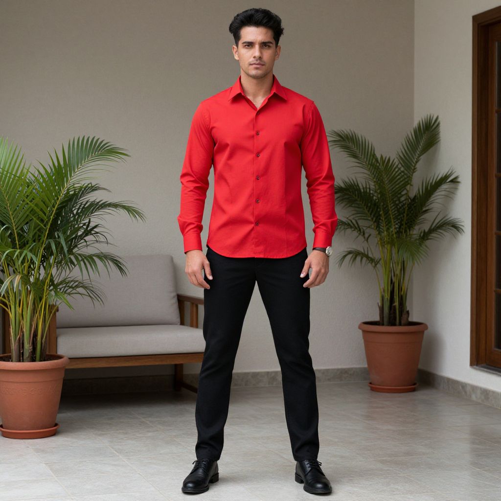 Fashion Shirts Costume, a man in a red shirt and black pants standing on a patio