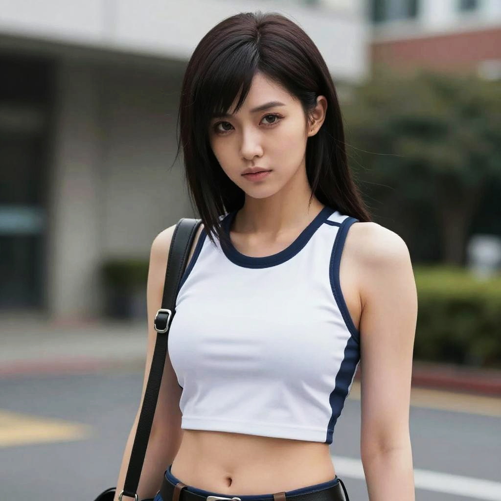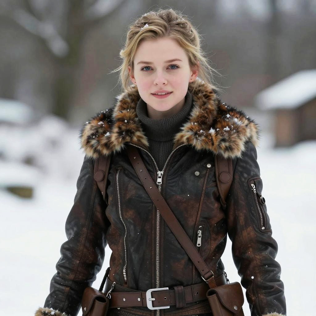 Misty wearing a sleeveless crop top and shorts with suspenders, styled in winter with natural photograph style. The portrait has realistic shading, soft lighting, and a pleasant yet edgy expression, inspired by Greg Rutkowski, Artgerm, Jeremy Lipkin.