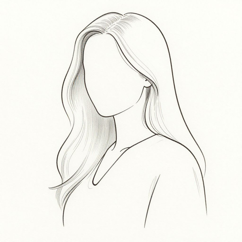 Black and white line drawing of a faceless woman with long, flowing hair, minimalistic style, simple outlines, white background.