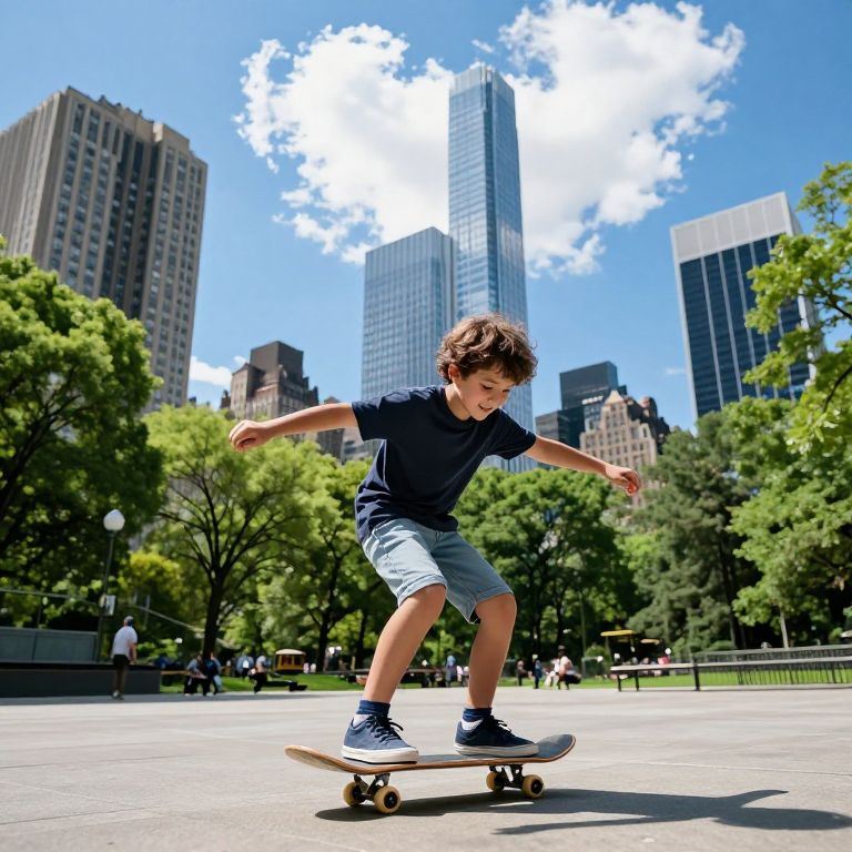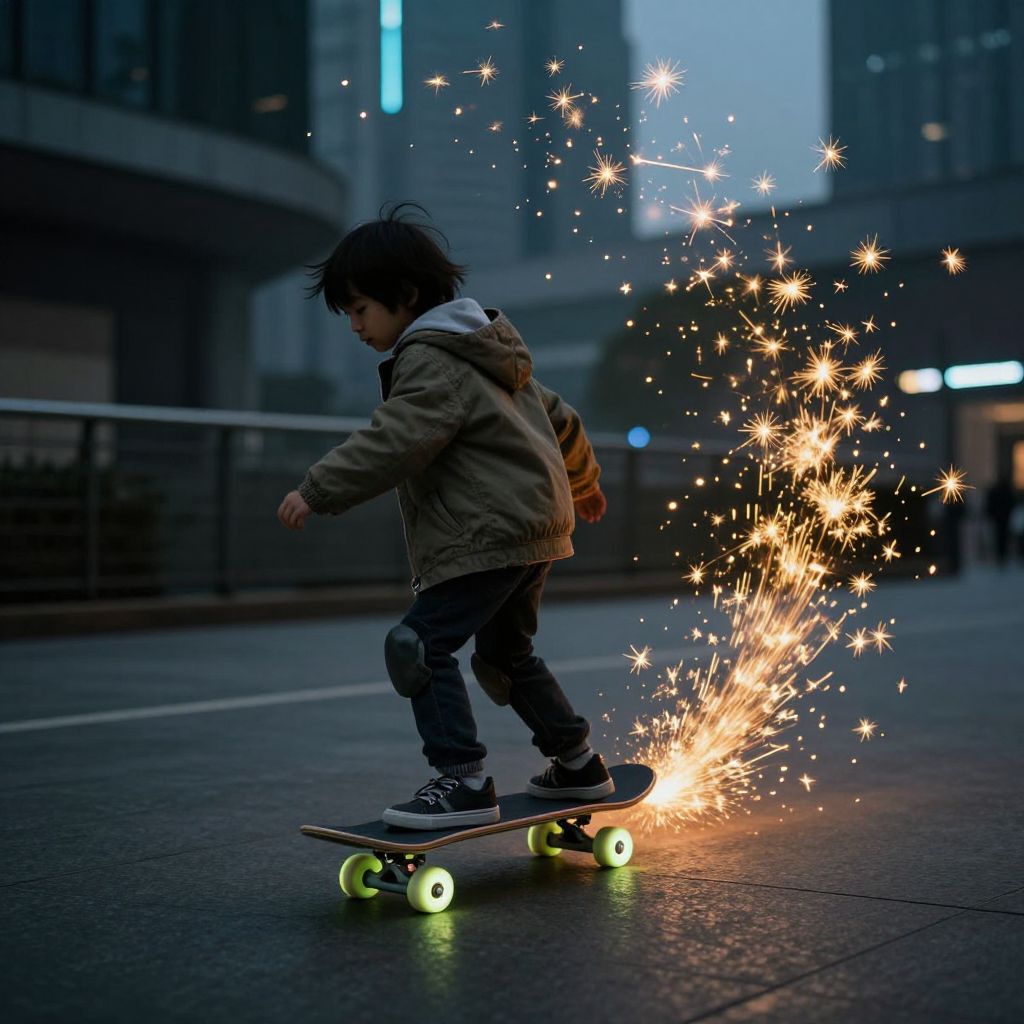 A child in a cozy jacket glides on a skateboard adorned with luminous wheels, leaving behind a mesmerizing trail of golden sparks that shimmer like constellations against the moody, atmospheric backdrop of a cyberpunk-inspired evening.