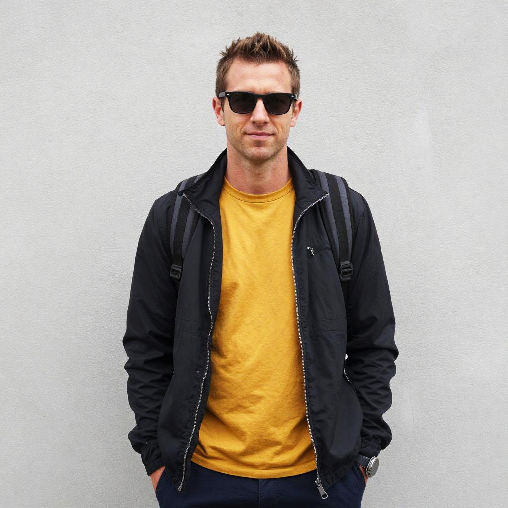 Young Caucasian man wearing a mustard yellow t-shirt and a black zip-up jacket, paired with dark sunglasses and a watch. He is standing against a plain light-grey wall with his hands in his pockets, carrying a black backpack.