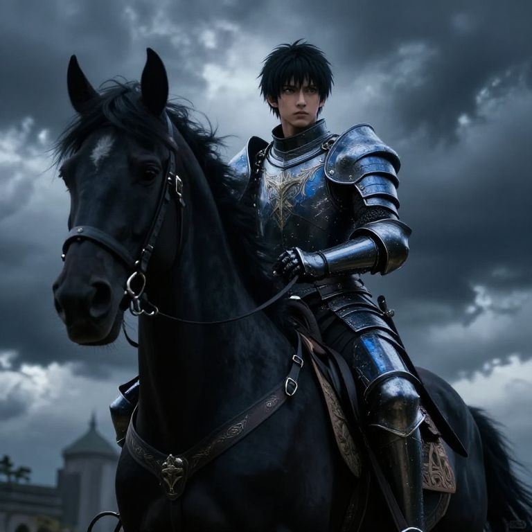 Silhouetted anime knight in shiny armor with flowing cape stands on rocky cliff at sunset, overlooking distant castle city. Digital art.