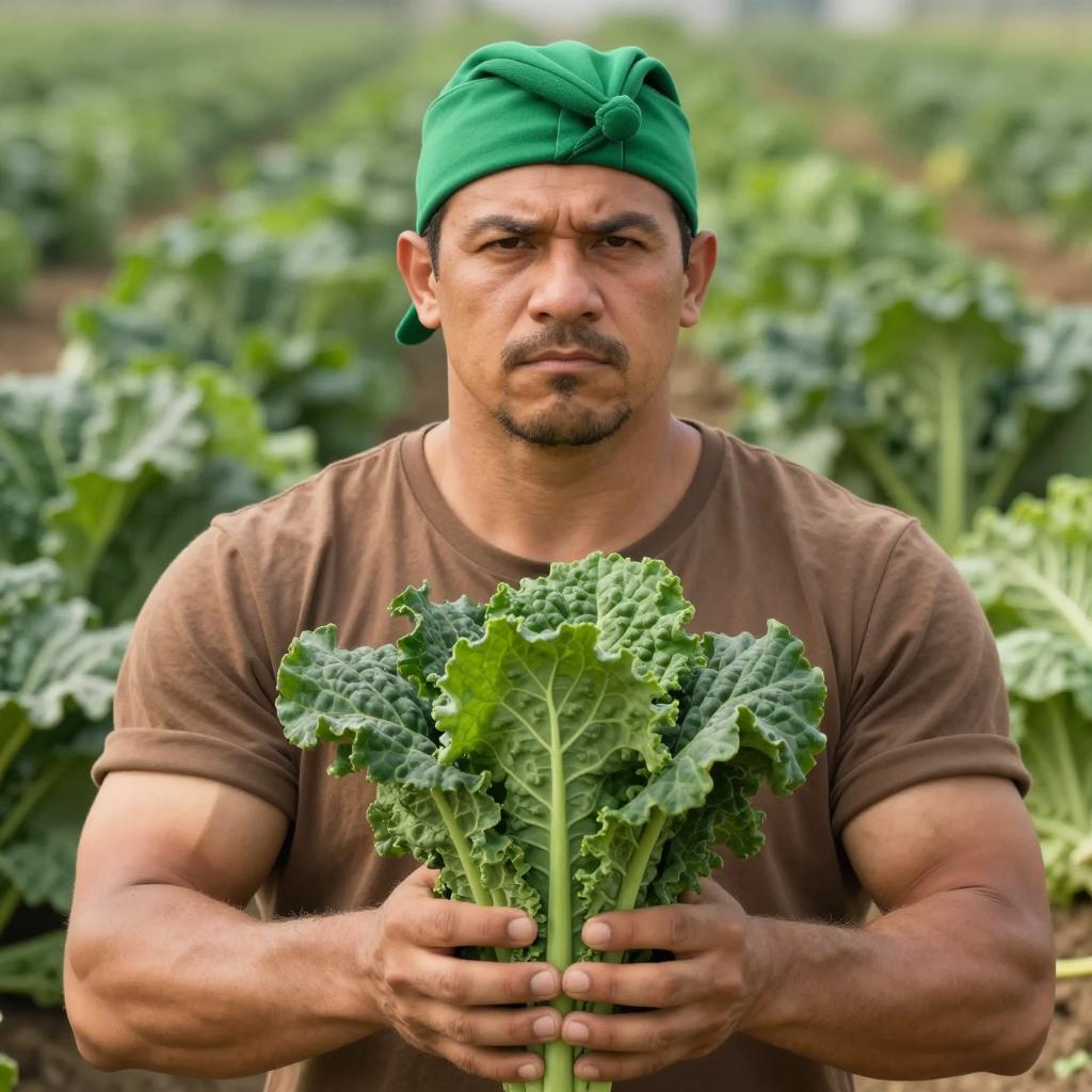Photorealistic close-up of a muscular male farmer with medium skin tone and short beard wearing a brown t-shirt and green headwrap. He is holding fresh kale in both hands with a serious expression. The background is filled with leafy green kale plants in a natural outdoor setting, highlighting a healthy lifestyle and vegetable farming.