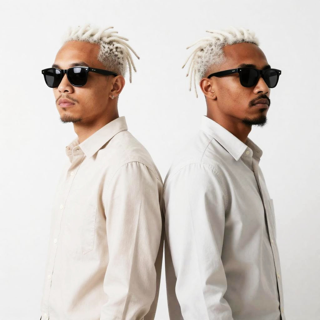 Three men in a dimly lit parking garage. Two wear white suits and have long white dreadlocks, one stands, one leans back on car. Third man in black suit, bald, pulling on a rope, pushing one in white suit. Black car in background. Intense expressions.