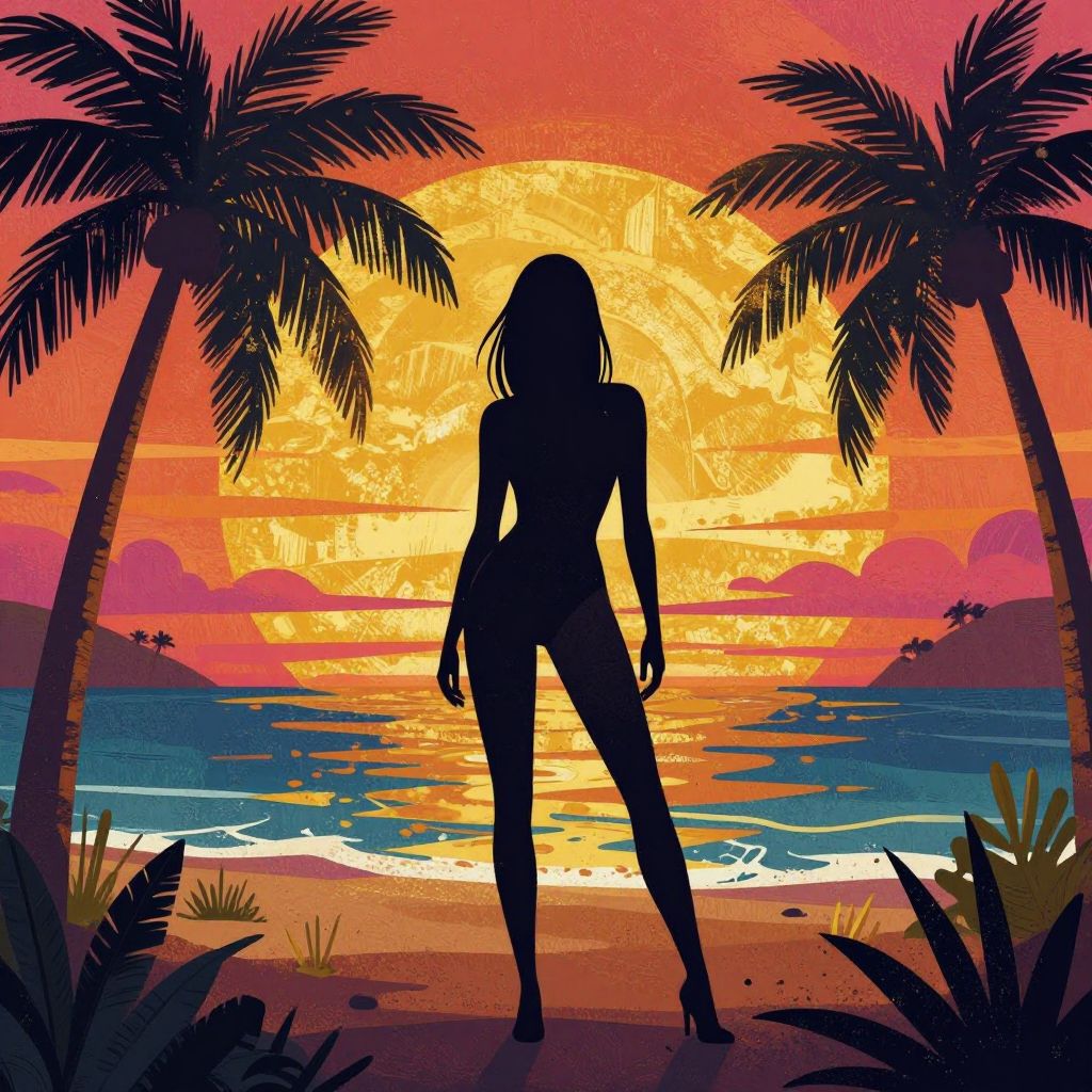 Digital illustration of a silhouetted woman standing on a tropical beach at sunset. She has a slim, toned physique and shoulder-length hair. The background features a large, glowing orange sun setting over a calm ocean, with palm trees on either side. The sky is a gradient of orange, yellow, and pink. The beach has dark sand with scattered plants in the foreground. The overall style is vibrant and stylized, with bold colors and sharp contrasts. The woman's figure is dark, creating a striking silhouette against the bright, colorful sunset.