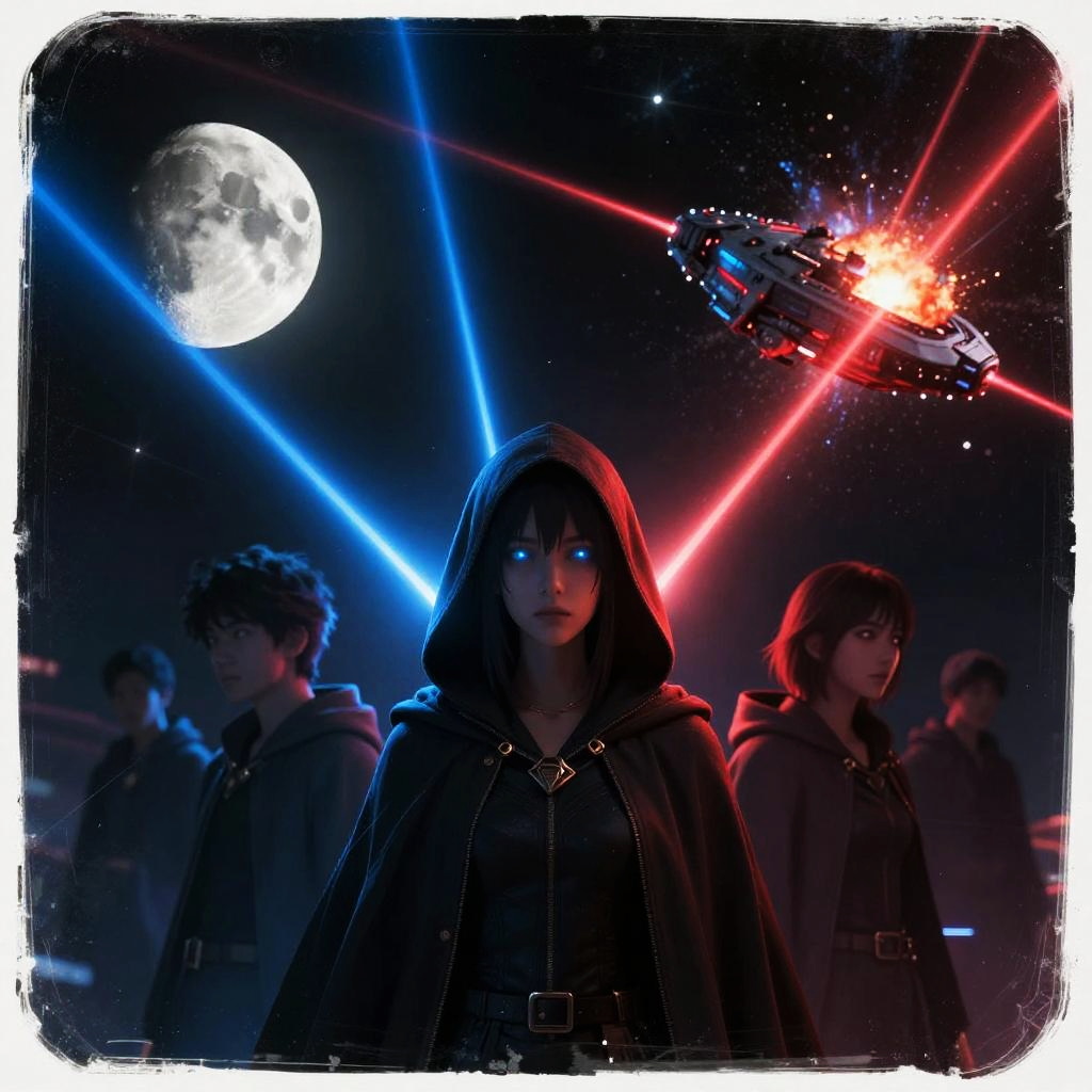 Digital art depicting a dark, sci-fi scene. In the foreground, a young woman with pale skin and glowing blue eyes stands center, wearing a black hooded cloak with a metallic emblem. Her serious expression contrasts the vibrant background. Behind her, three shadowy figures in similar cloaks stand in silhouette. Bright blue and red laser beams cross the dark sky, converging near a large, detailed moon. In the upper right, a spaceship explodes in a blaze of red and orange light against the starry backdrop. The image has a white, rough-edged border, enhancing the dramatic, cinematic feel.