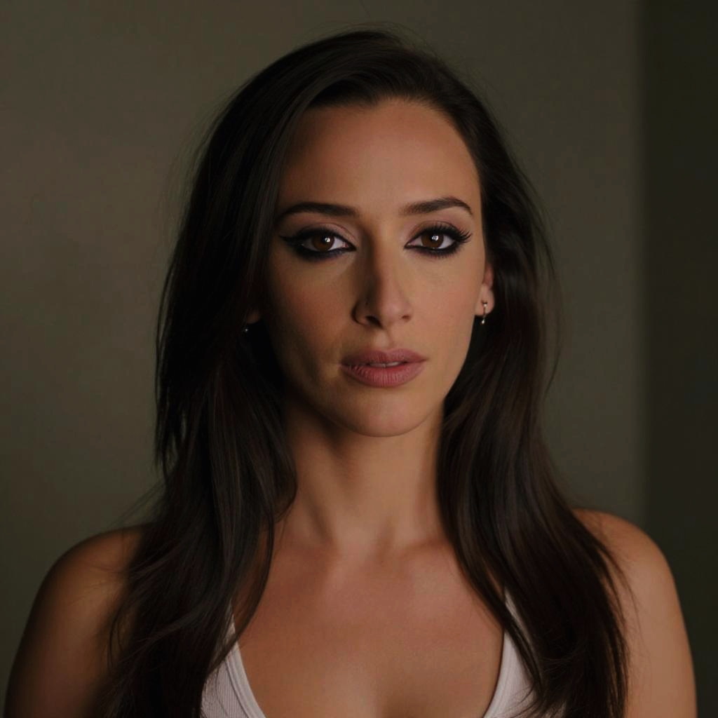 Eye reflection, winged eyeliner, (looking at the viewer:1.3), best shadow, intricate details, interior, muted colors, epic character composition, frontal view, atmospheric scene, masterpiece, best quality, (detailed beautiful face, detail skin texture, ultra-detailed body:1.1), diffused lighting, jenniferconnelly-co-smf, 1girl, solo, breasts, earrings, realistic, jewelry, long hair, tank top, cleavage, upper body, medium breasts, brown hair, lips, white tank top, shirt, black hair