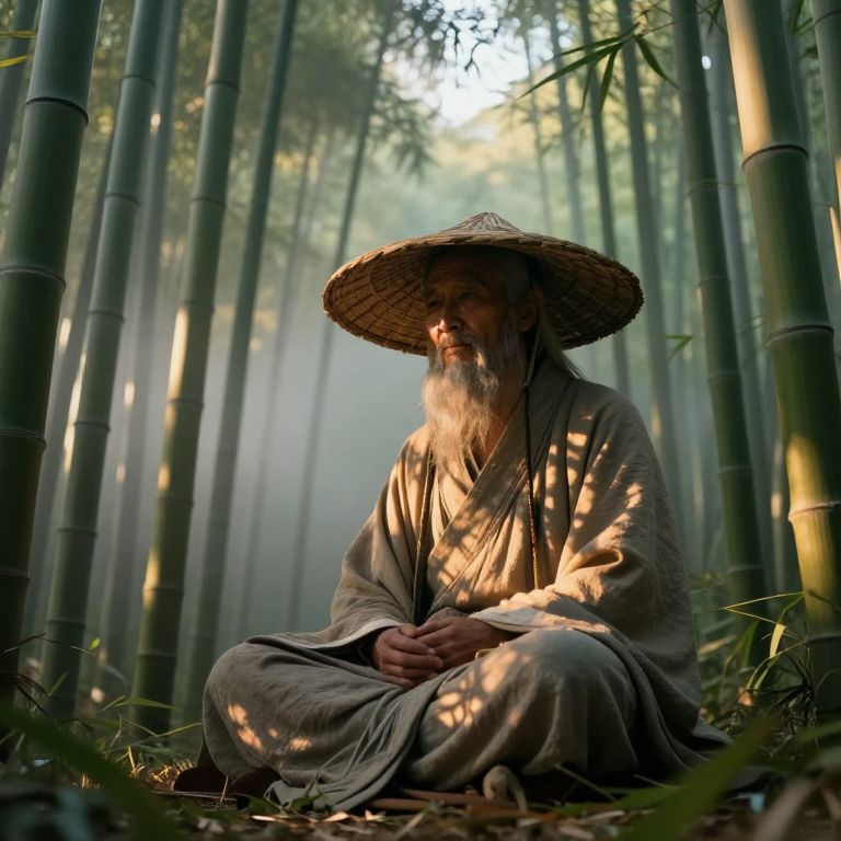 Photograph of an elderly Asian man with a long, white beard, sitting cross-legged on the forest floor. He wears a wide-brimmed, conical straw hat and a loose, beige robe. Tall, green bamboo stalks surround him, with sunlight filtering through the trees, creating a misty, ethereal atmosphere. The man's expression is calm and contemplative, his hands resting in his lap. Shadows of bamboo leaves fall across his robe, adding texture to the scene. The background is lush and dense, emphasizing the tranquil, natural setting.