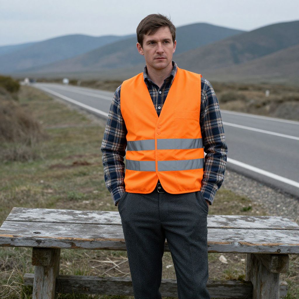 Photograph of a Caucasian man with short brown hair, standing outdoors on a wooden bench beside a rural road. He wears a bright orange high-visibility vest over a black and white plaid shirt, and dark gray trousers. His hands are in his pockets, and he has a serious expression. The background features rolling hills and a gray, overcast sky. The road is narrow with a white line in the center, extending into the distance. The wooden bench is weathered, adding a rustic feel to the scene.
