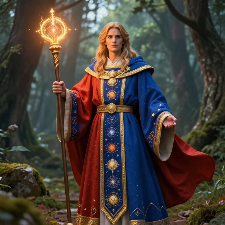 Dnd cleric clothes, vibrant ceremonial robes with gold trim and embroidered patterns of celestial bodies, flowing yet protective attire, cleric holding a glowing staff in a mystical forest clearing, fine fabric details and dynamic lighting effects