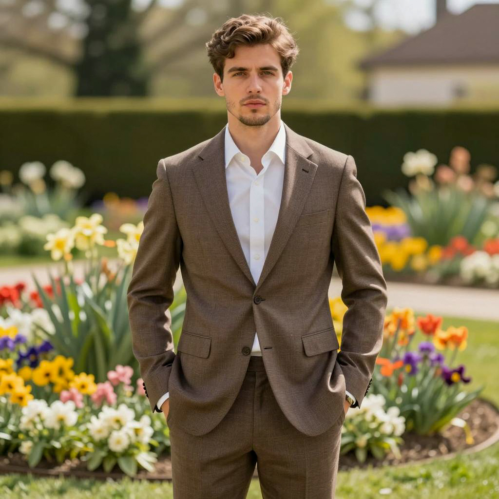 Semi formal attire man, photograph of a handsome young man with short brown hair, light stubble, wearing a brown checked suit, white dress shirt, standing in a vibrant garden, colorful flowers, sunny day, blurred background, serious expression, hands in pockets, realistic, high quality, daytime, outdoor setting, lush greenery, soft shadows, spring atmosphere