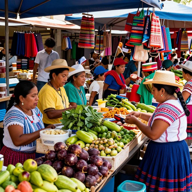 Tipicos vibrant market scene filled with colorful stalls showcasing fresh produce, handmade crafts, and traditional foods, lively vendors in traditional clothing, sunlit ambiance, rich cultural details, showcasing the essence of a Latin American marketplace.