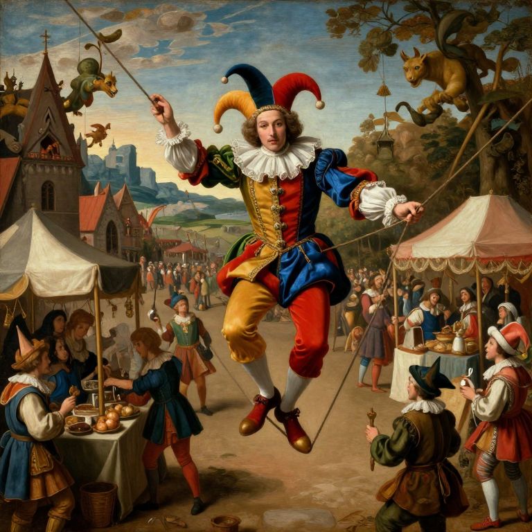 An enigmatic portrait showcases a jester gracefully poised on an aerial tightrope above a lively medieval market scene, reminiscent of Renaissance paintings viewed from an elevated perspective. The jester's attire masterfully blends Baroque fashion with modern circus elements, creating a vivid and intricate ensemble that contrasts against the bustling marketplace below. This dynamic image captures merchants selling exotic goods, jesters entertaining crowds, and mythical creatures mingling among humans, evoking a sense of wonder and nostalgia while blending historical charm with fairy tale imagination to create an emotionally rich tapestry that encapsulates both the exuberance of life and its transient nature.