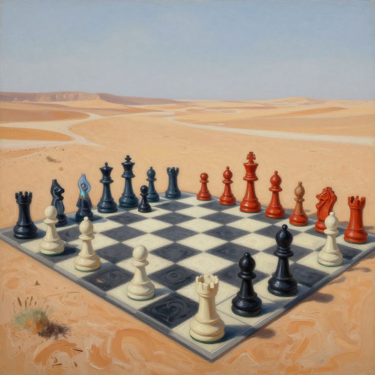A surreal oil painting depicts an expansive chessboard sprawling across an arid desert, its pieces in vibrant hues standing tall like imposing statues against the monochromatic background. The vastness of this enigmatic landscape contrasts with a lone figure possessing luminescent hair and intense gaze, navigating through the colossal game board, evoking a sense of solitude and introspection within the boundless expanse.
