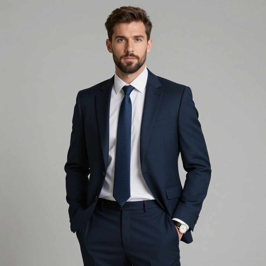Aiqa suit, 1boy, male focus, solo, necktie, watch, wristwatch, suit, formal, facial hair, beard, looking at viewer, white shirt, shirt, hand in pocket, collared shirt, blue necktie