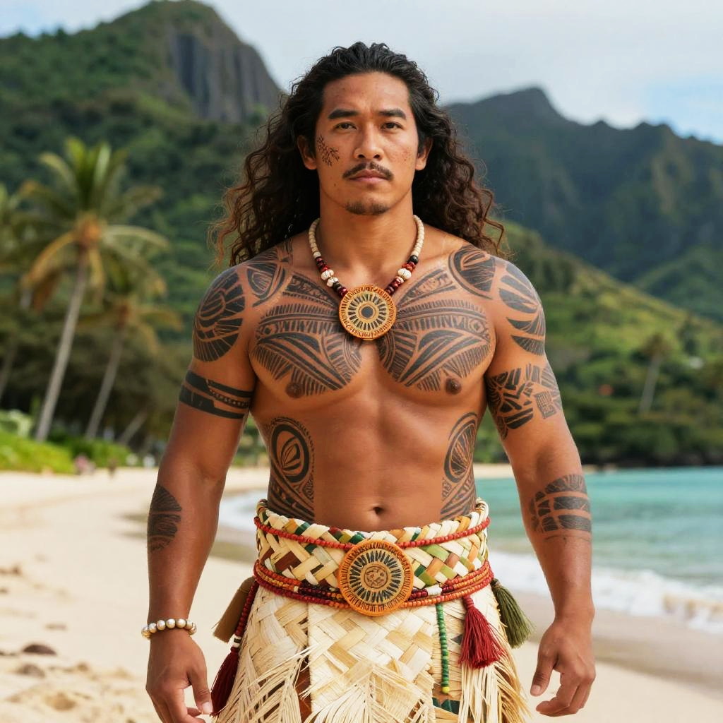 Photograph of a muscular, tattooed, tan-skinned man with long black hair, wearing a traditional Hawaiian loincloth and necklace, standing on