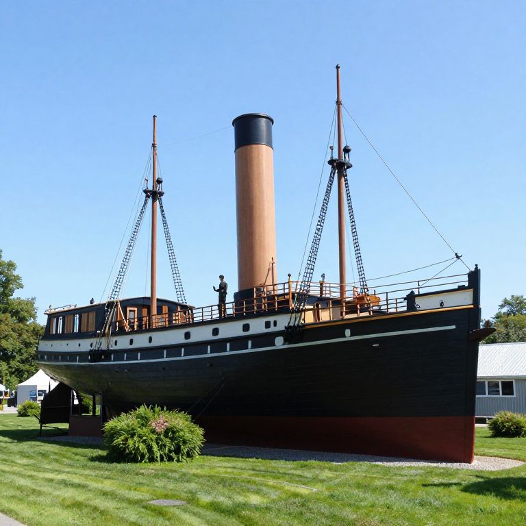 Ticonderoga ship replica prominently displayed outdoors at the Shelburne Museum, featuring a dark wooden hull, a tall smokestack, and a figure standing on its deck, set against a backdrop of green lawns, scattered shrubs, and a clear blue sky.