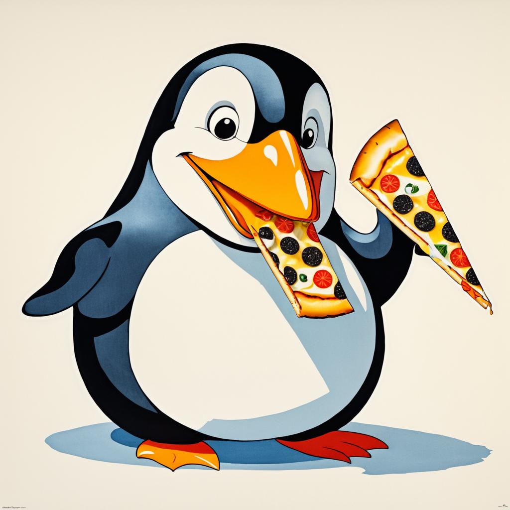 Lithograph of an anthropomorphic penguin eating a pizza.