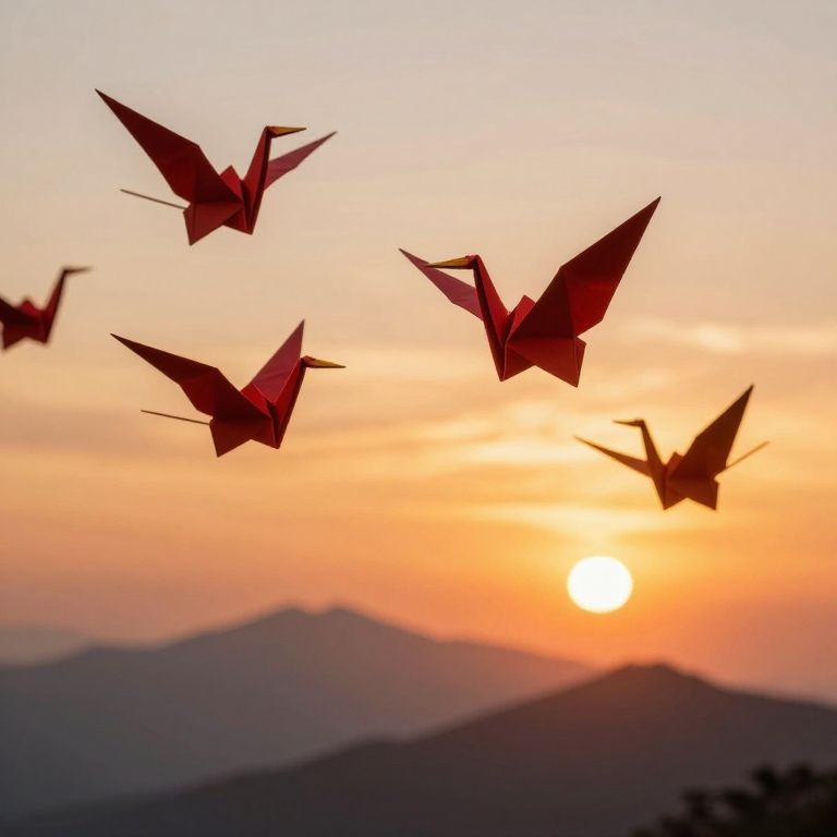 A vibrant, digital watercolor illustration of nine origami birds in various bright colors (yellow, blue, orange, purple) flying in a circular formation against a soft, pastel sky. The background features a gradient of blue, pink, and white, resembling a cloudy sunset or sunrise. The birds are detailed with sharp, geometric folds, creating a three-dimensional effect. The overall style is whimsical and light, with a gentle, dreamy atmosphere. The image conveys a sense of freedom and movement.