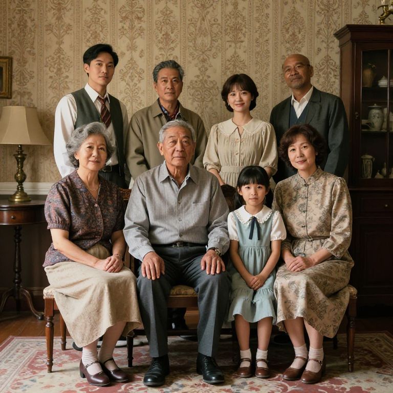 Kin portraits in a traditional style, diverse family members of multiple generations dressed in vintage clothing, posed thoughtfully in an old-fashioned parlor with ornate wallpaper and antique furnishings, capturing heritage and deep emotional ties.
