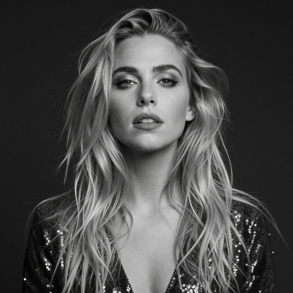Photograph of a blonde woman with long, wavy hair, wearing a strapless red satin dress with a black sequin heart on the chest. She gazes upward with a slight tilt of her head, her right hand resting on her chest. Bright light from the left creates a dramatic effect against the dark background.
