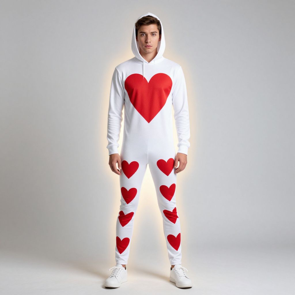 Love leggings costume, solo, heart print, 1boy, male focus, heart, hood, full body, shoes, standing, realistic, looking at viewer, aura, white footwear