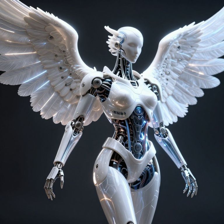This digital CGI image depicts a futuristic, humanoid robot with white, metallic wings and a sleek, cybernetic body. The robot has a smooth, shiny surface with intricate wiring visible on its chest, abdomen, and arms. Its wings are large, detailed, and feathered, glowing with a soft white light. The robot's head is featureless, with a streamlined, helmet-like design. It stands against a dark, gradient background, which contrasts with its bright, reflective surfaces. The overall style is high-tech and ethereal, combining elements of angelic and robotic aesthetics. The lighting emphasizes the robot's contours and metallic texture.